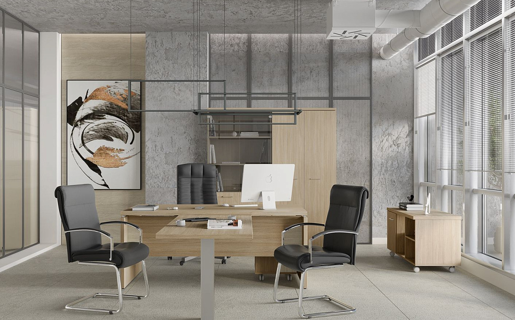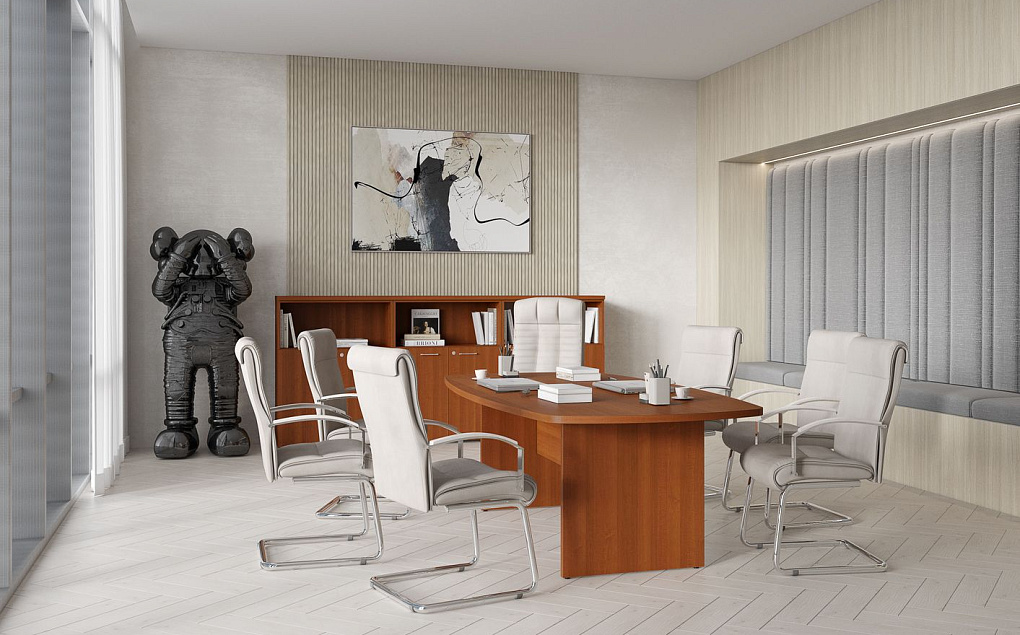 В составе кабинета присутствует модульная линейка переговорных столов на опорах-колоннах из нержавеющей стали.