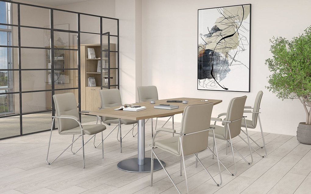 Большой выбор столов для переговорных зон разнообразных форм: прямоугольные, овальные, круглые.