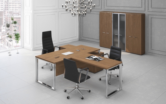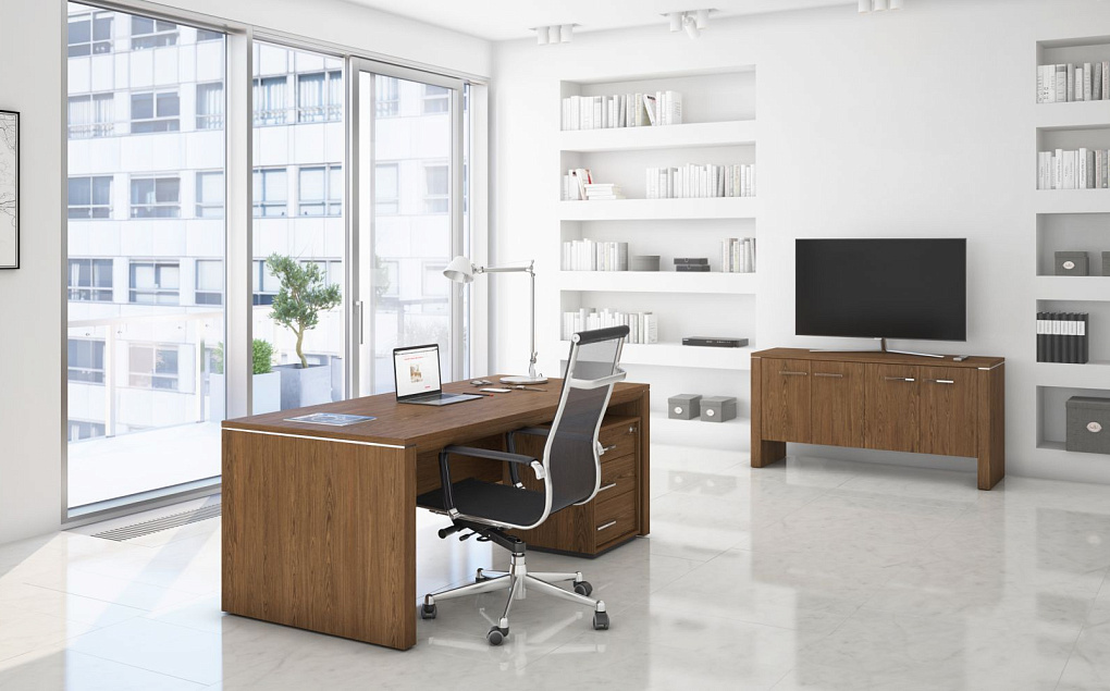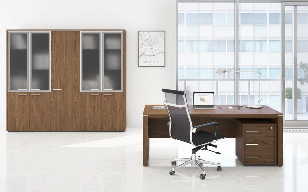 Толщина: столешниц столов для руководителей, брифинг-приставок – 75 мм, переговорных столов – 83 мм, опор столов – 70 мм; топов шкафов – 33 мм, каркасов шкафов (за исключением полок), перегородок и полок тумб – 16 мм; каркасов тумб, фасадов – 17 мм; боковых декоративных панелей – 26 мм; полок шкафов – 25 мм.