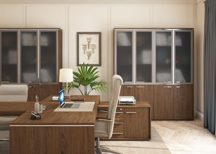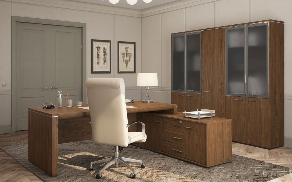 Особенности: столешницы рабочих и переговорных столов, брифинг - приставок имеют утолщения декоративными профилями из МДФ толщиной 50 мм, фанерованными шпоном дуба. Все декоративные вставки на столах, брифингах и топах шкафов имеют декоративное покрытие «хром глянец», также хромированные вставки имеются в столешницах переговорных столов. Лицевая металлическая фурнитура выполнена в декоре «хром глянец». Стеклянные алюминиевые рамочные фасады выполнены в глянцевом декоре в сочетании с матированным стеклом серого дымчатого оттенка. Тангенциальный рисунок шпона дуба в табачной тонировке максимально подчеркивает текстуру натурального материала. Декоративные боковые панели и топы шкафов (единые на группу из нескольких шкафов) также фанерованы шпоном дуба, что придает шкафной композиции законченный вид, а всему кабинету статусность и солидность.