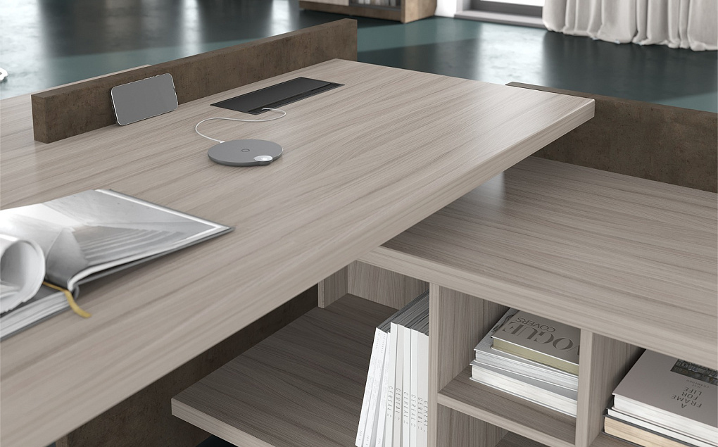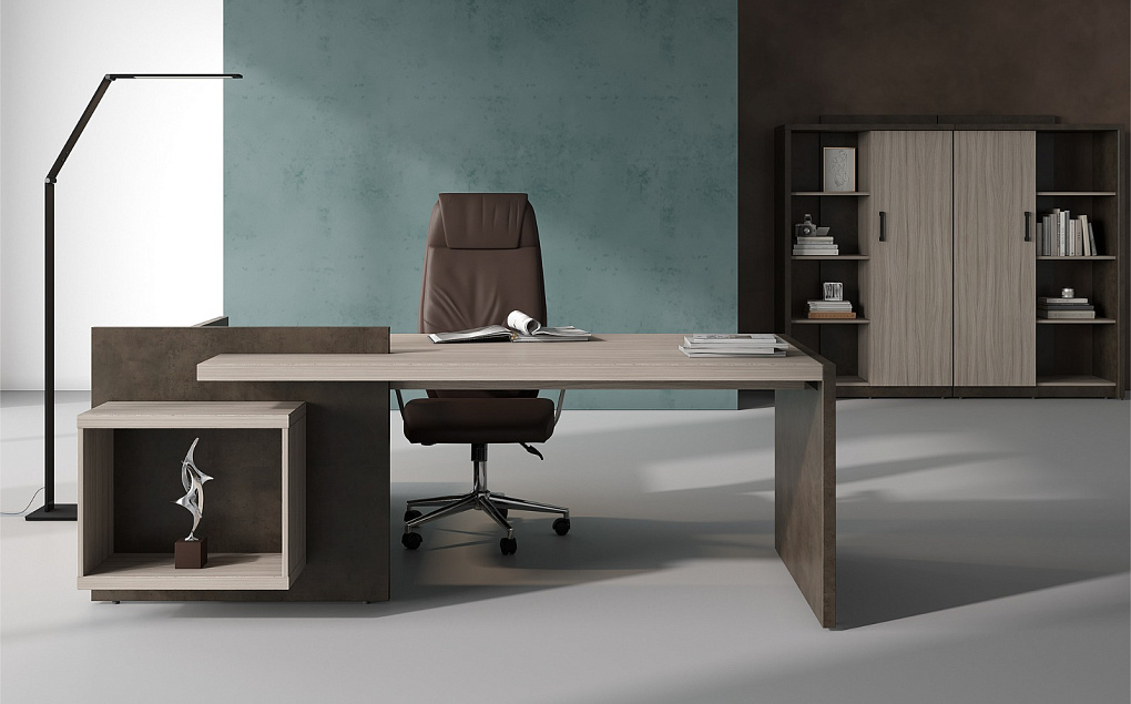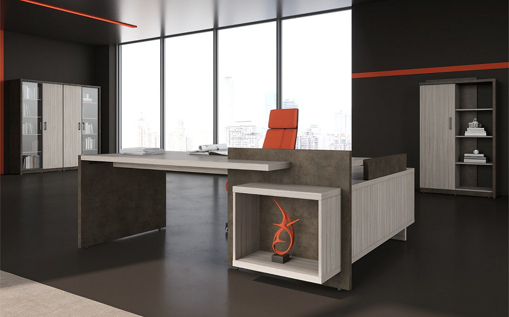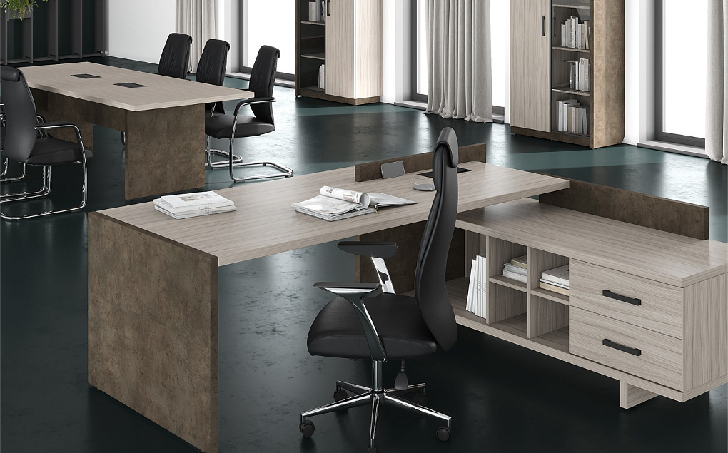 Коллекция WOOD&STONE представляет собой уникальное сочетание выразительных форм и текстур. Здесь брутальность декора Бетон Чикаго Темный гармонично объединяется с изяществом светлого древесного декора Дрифтвуд, создавая запоминающийся визуальный контраст. Функциональность коллекции проявляется в продуманной организации пространства. Например – полки, строго адаптированные под формат А4, или декоративная планка на столешнице, которая создает приватную область для хранения личных аксессуаров, скрытую от глаз посетителей. Эстетика WOOD&STONE также подчеркивается эффектными деталями, включая ниши, которые могут использоваться для демонстрации наград и аксессуаров, добавляя изящество и функциональность. Баланс контрастов и забота о комфорте – основные принципы, которые легли в основу коллекции. Технические характеристики коллекции: Основной материал: ЛДСП класс Е1, 38мм и 18 мм Защита торцов изделий из ЛДСП: ABC — кромка 2 мм; 0,45 мм Лицевая фурнитура: металлические ручки черного цвета, покрытие «сатин» («матовый хром»), кабель–менеджмент Внутренняя фурнитура: Hettich, Hafele, SISO. Все распашные двери шкафов и комода оснащены петлями Hettichс доводчиком. Все выдвижные ящики оснащены скрытыми шариковыми направляющими полного выдвижения Hettichс доводчиком