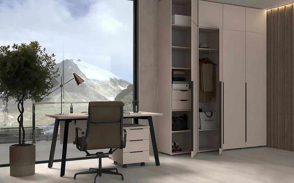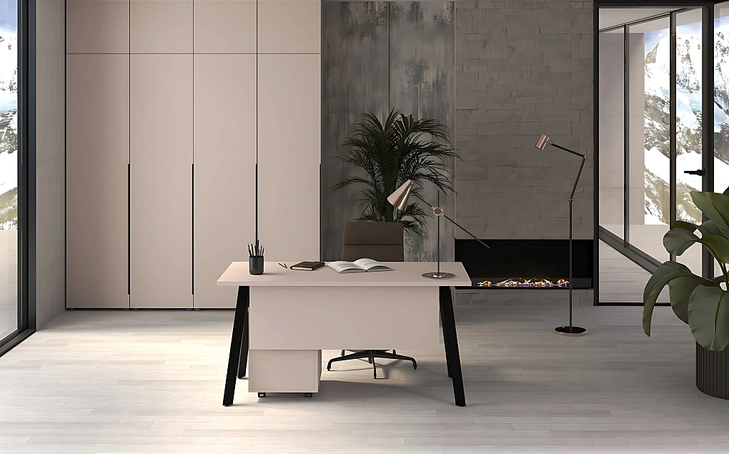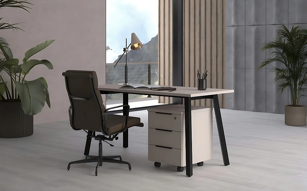 Серия Makalu будет выигрышно смотреться и как отдельное рабочее функциональное рабочее место, и как системное решение для организации офисных пространств любой площади: от отдельных кабинетов до открытых пространств. • Рабочие столы на устойчивом А-образном металлокаркасе. • Высокие шкафы-пеналы • Тумбы и шкафы-купе с раздвижной системой дверей (экономия пространства) • Дополнительные элементы к шкафам: антресоли и выдвижные ящики для расширения вместимости. • Исполнение в монохромном цвете «Кашемир». • Металл каркасов столов окрашен порошково-полимерной краской черного цвета с текстурой муар • Черная матовая фурнитура.