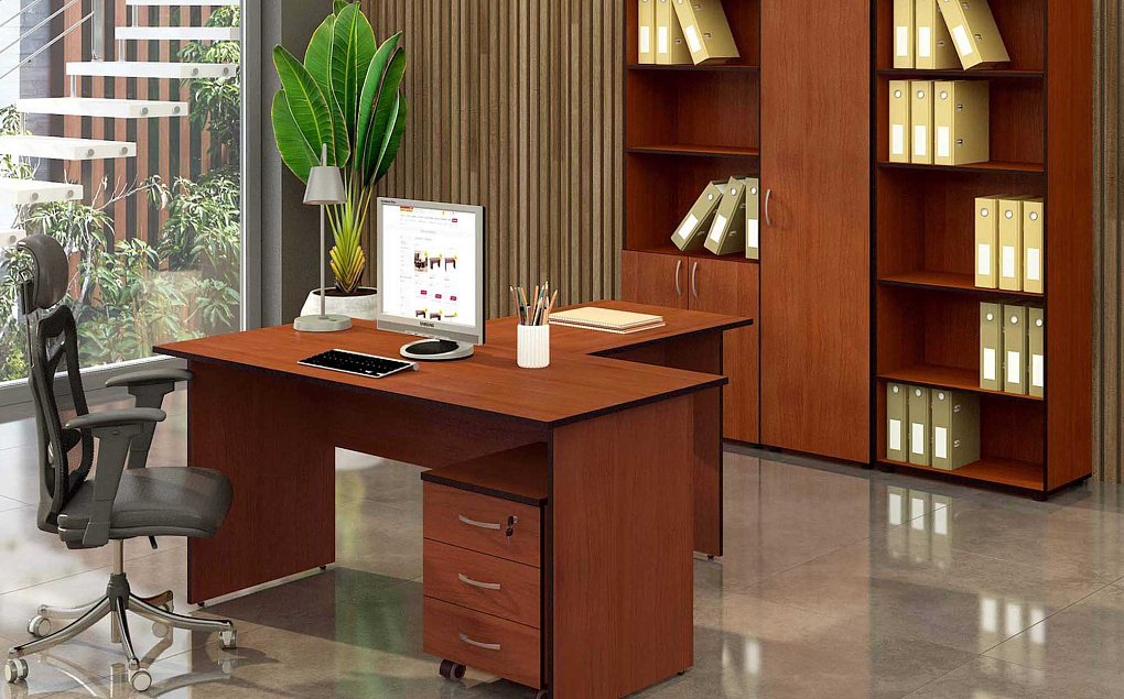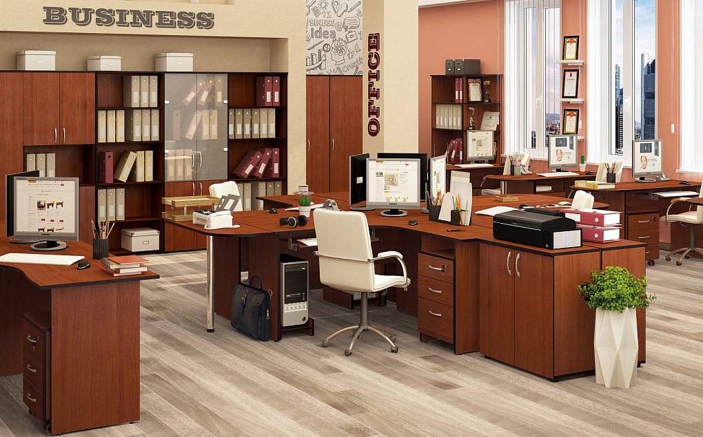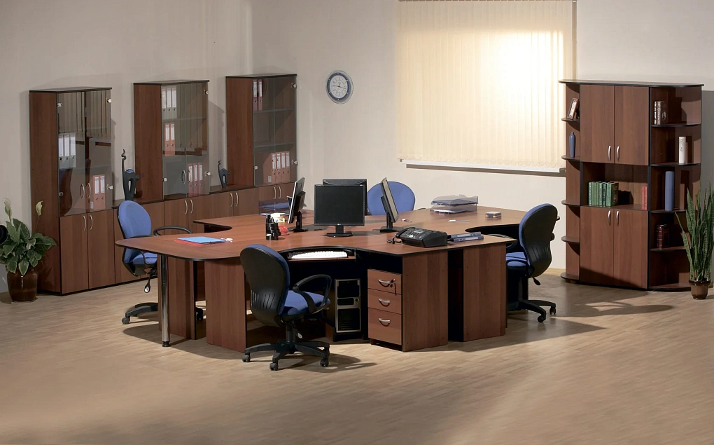 Приятный кофейный оттенок офисного набора создает располагающую обстановку для работы и переговоров, а продуманный функционал мебели сбережет Ваше время.