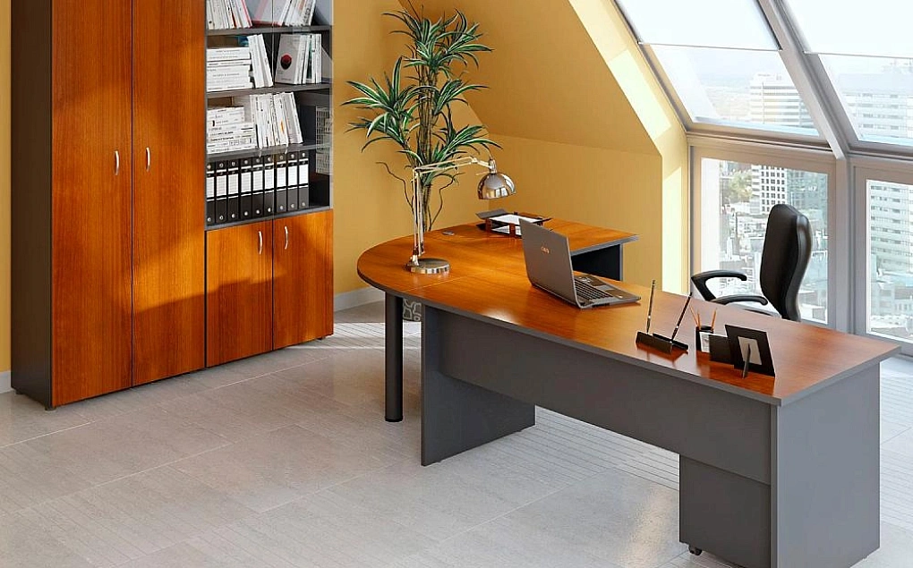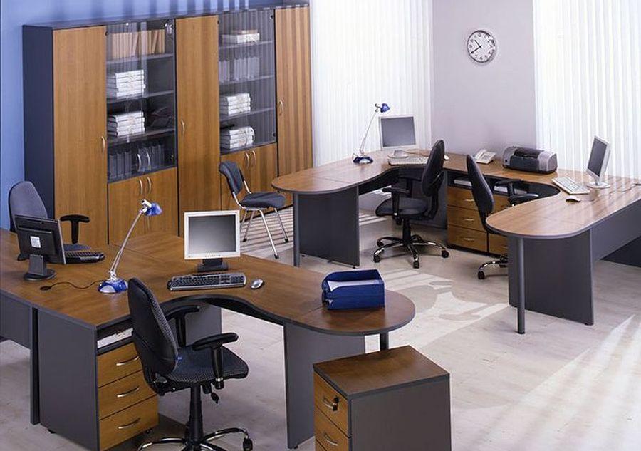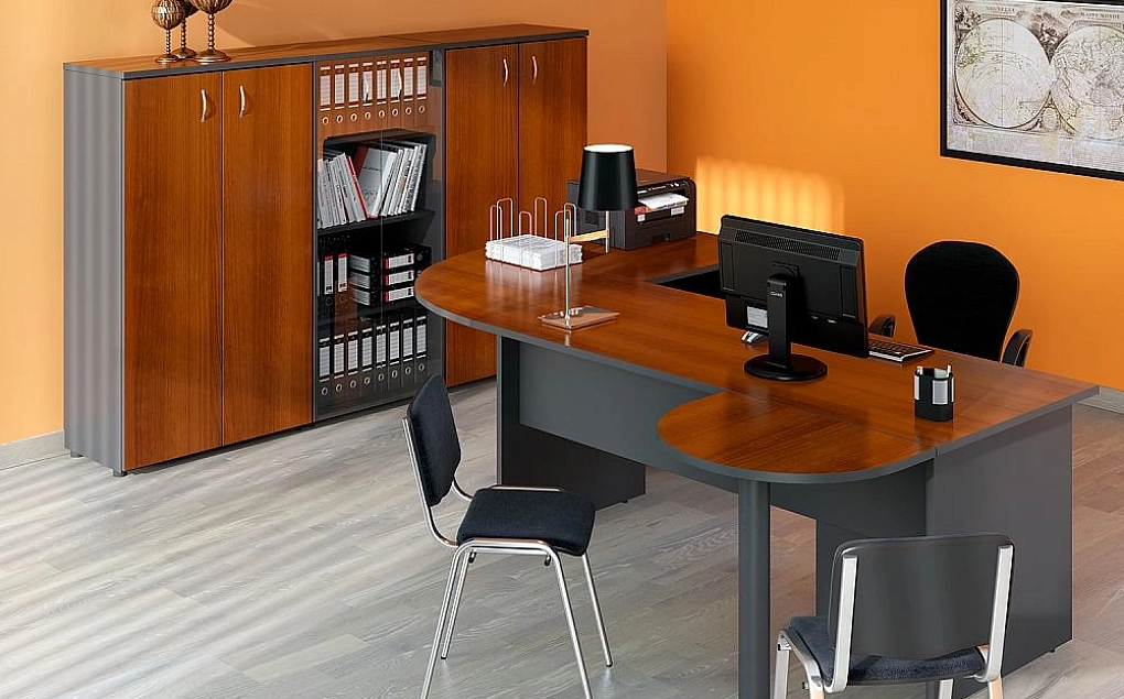Много вспомогательных столов и элементов. Например, тумба под крупную оргтехнику или набор стеллажей.