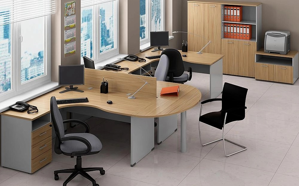Много вспомогательных столов и элементов. Например, тумба под крупную оргтехнику или набор стеллажей.
